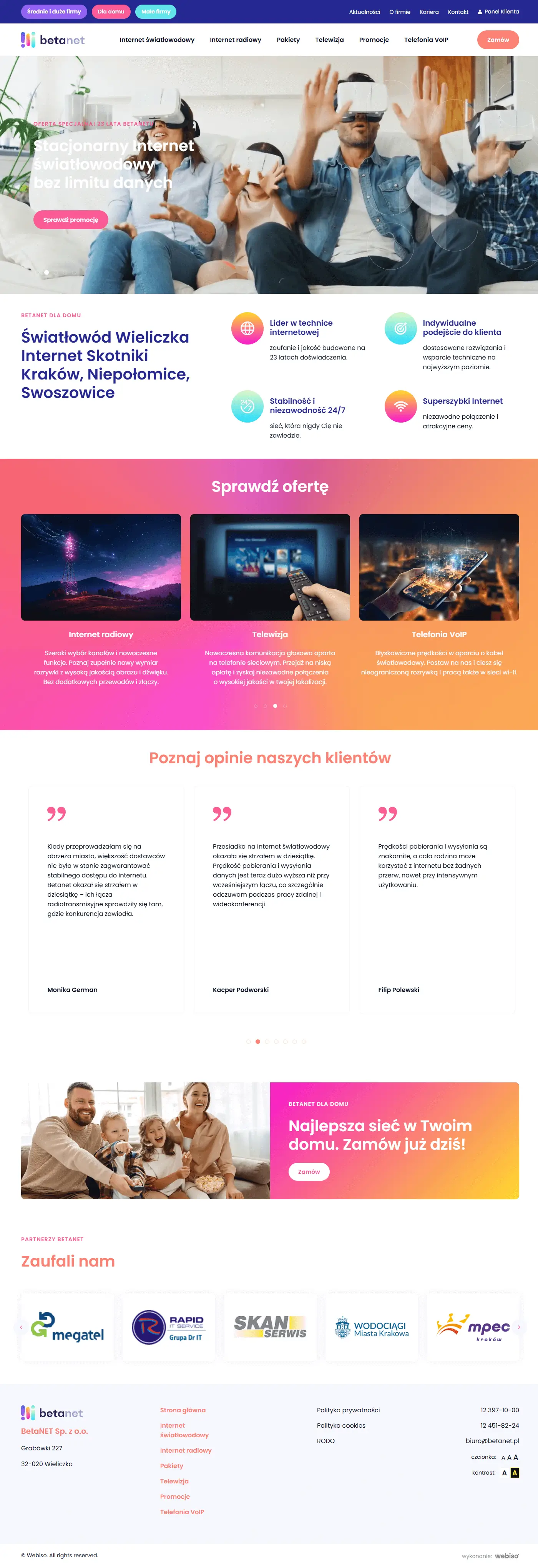 Strona internetowa Betanet została zaprojektowana z myślą o przejrzystej prezentacji trzech głównych sektorów ich usług - dla klientów indywidualnych, małych firm oraz średnich i dużych przedsiębiorstw. Każda z podstron wyróżnia się dedykowaną kolorystyką zaczerpniętą z palety logo, co nadaje im indywidualny charakter, a jednocześnie buduje spójną identyfikację wizualną marki. Górne sekcje “top” wzbogacone zostały o elementy graficzne logo, co podkreśla nowoczesny i estetyczny styl witryny.