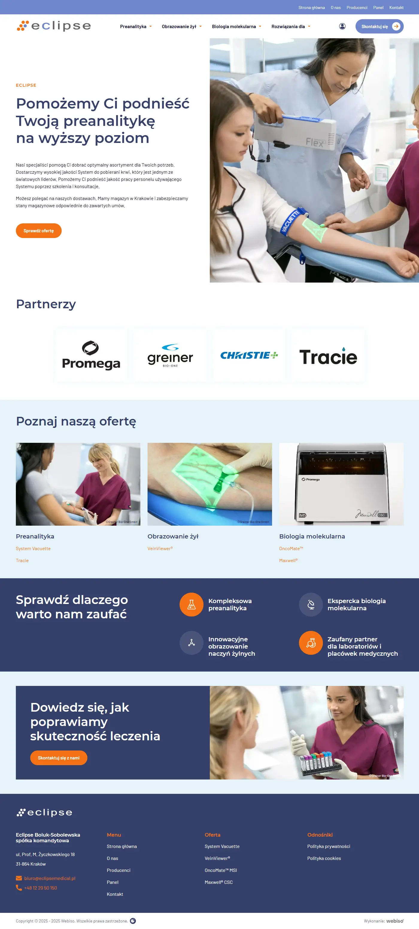 Zaproponowaliśmy nową strukturę strony, obejmującą kluczowe działy: Preanalityka, Obrazowanie żył, Biologia molekularna oraz Rozwiązania dla... - każda z tych sekcji została dostosowana do konkretnej grupy odbiorców i prezentuje produkty, których firma jest dystrybutorem. Dzięki temu użytkownicy z branży medycznej mogą szybciej odnaleźć interesujące ich rozwiązania, ai cała oferta stała się bardziej intuicyjna i uporządkowana.