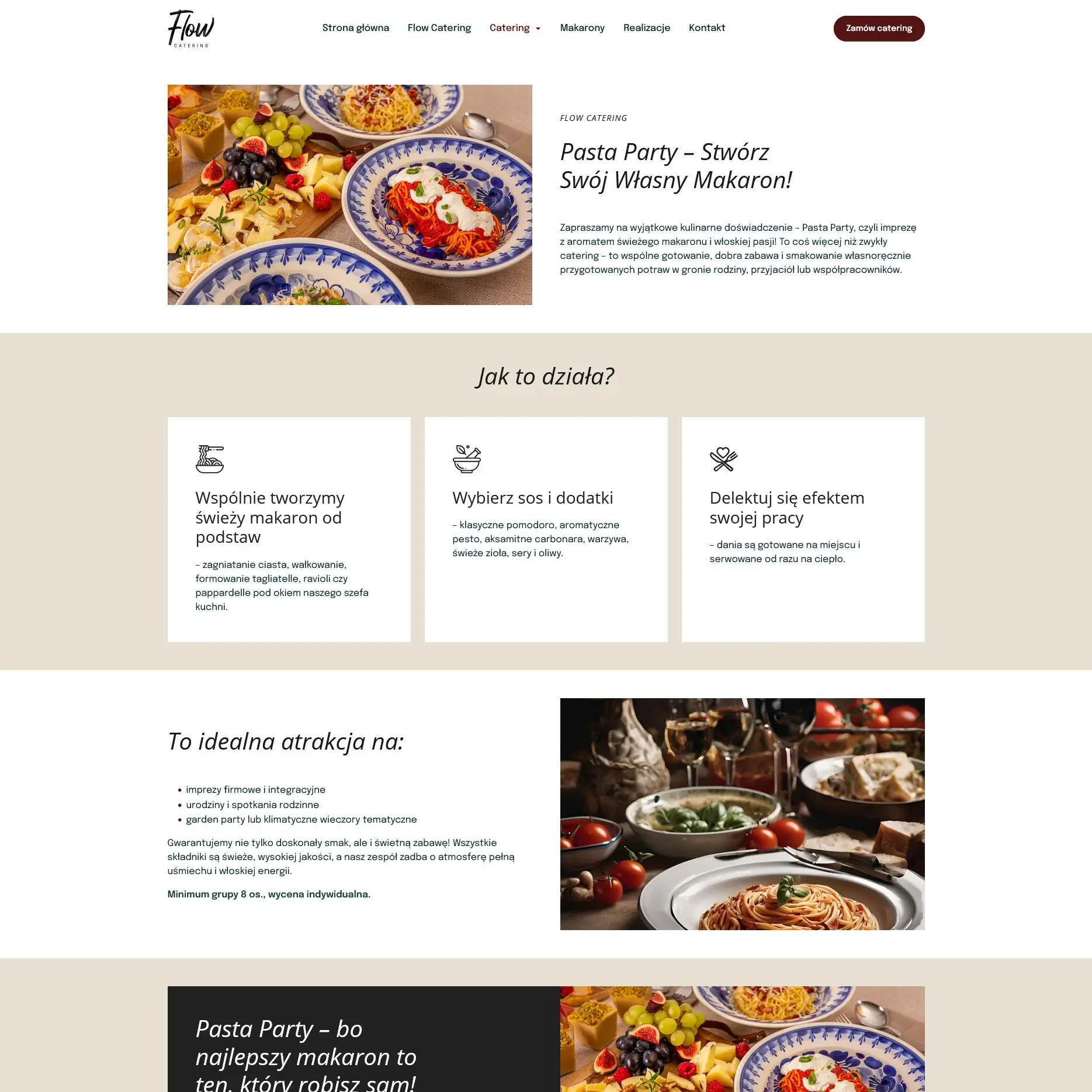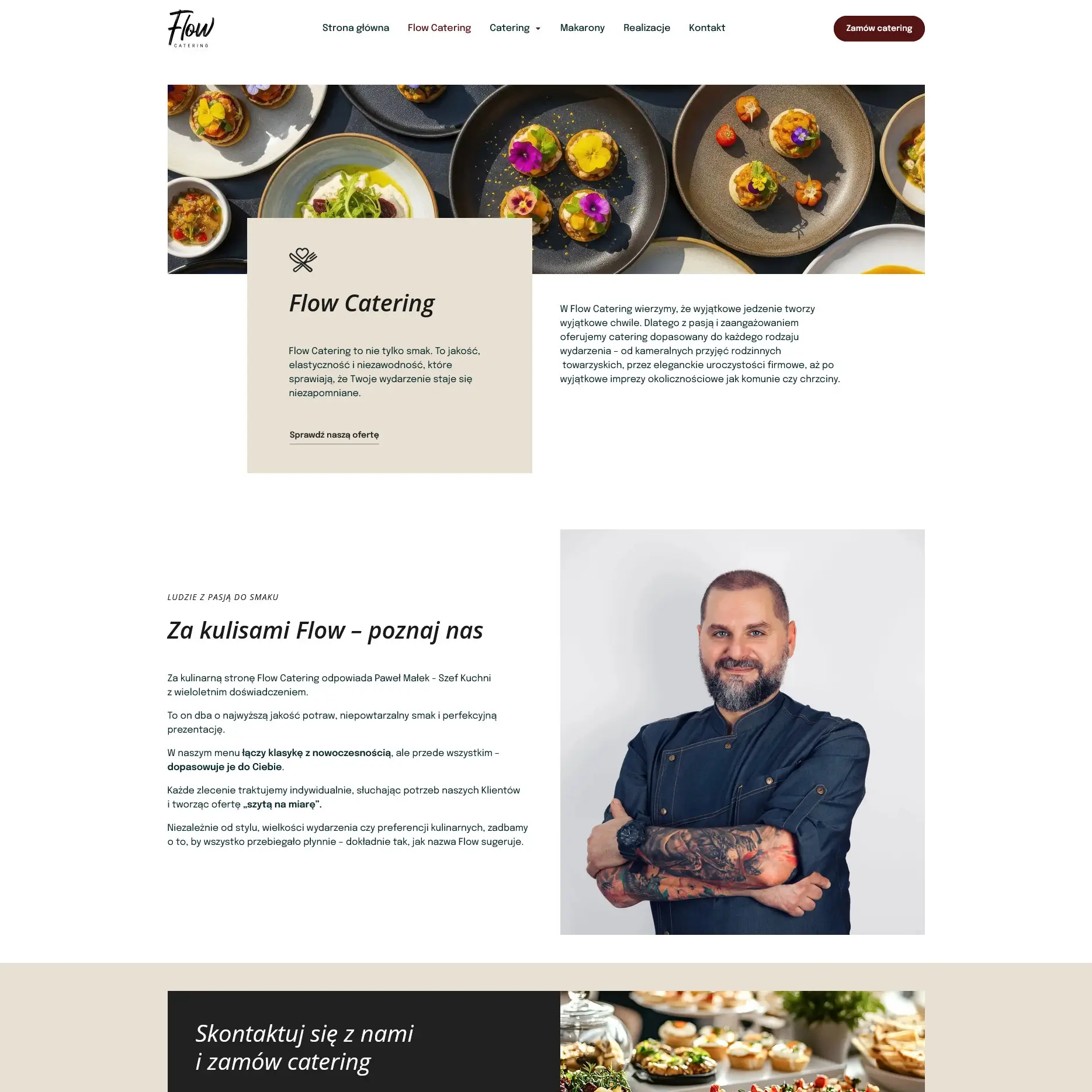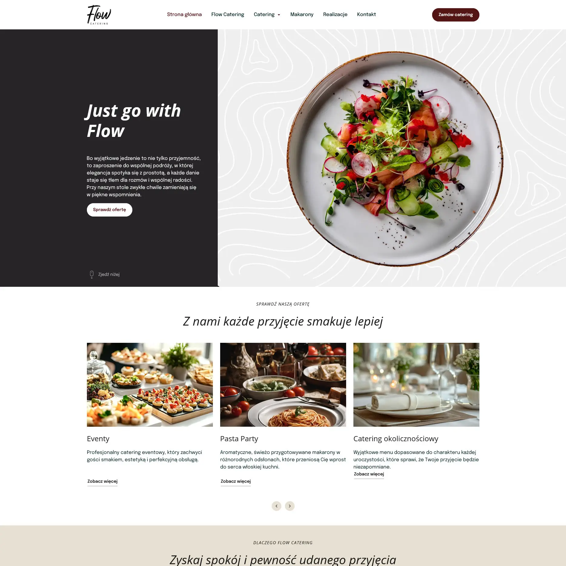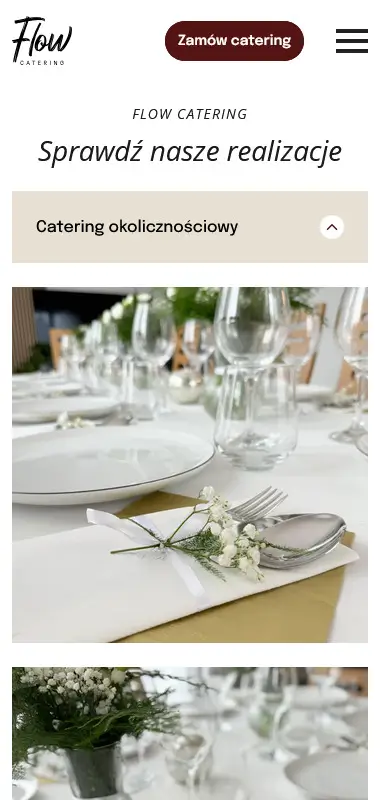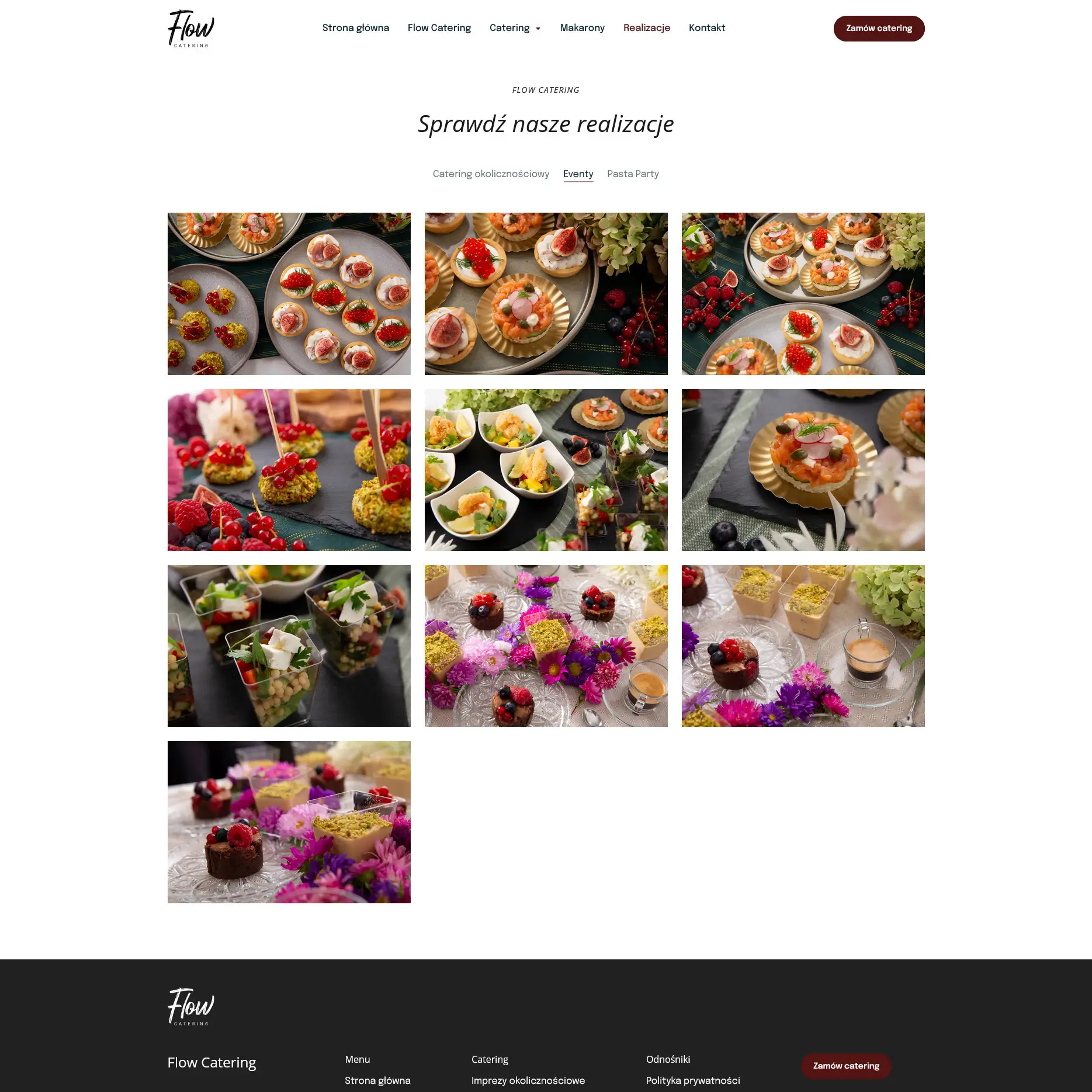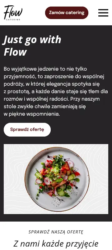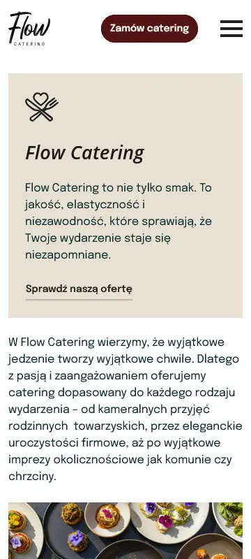 Zdjęcia potraw i realizacji odgrywają tu dużą rolę, bo najlepiej pokazują, jak wygląda praca Flow Catering i czego można spodziewać się przy zamówieniu usługi. Podstrony z ofertą zostały ułożone tak, aby szybko można było sprawdzić różne opcje cateringu - od małych rodzinnych uroczystości po większe eventy. Wszystko jest podane w prosty sposób, bez zbędnych elementów, tak aby użytkownik nie musiał się przeklikiwać.