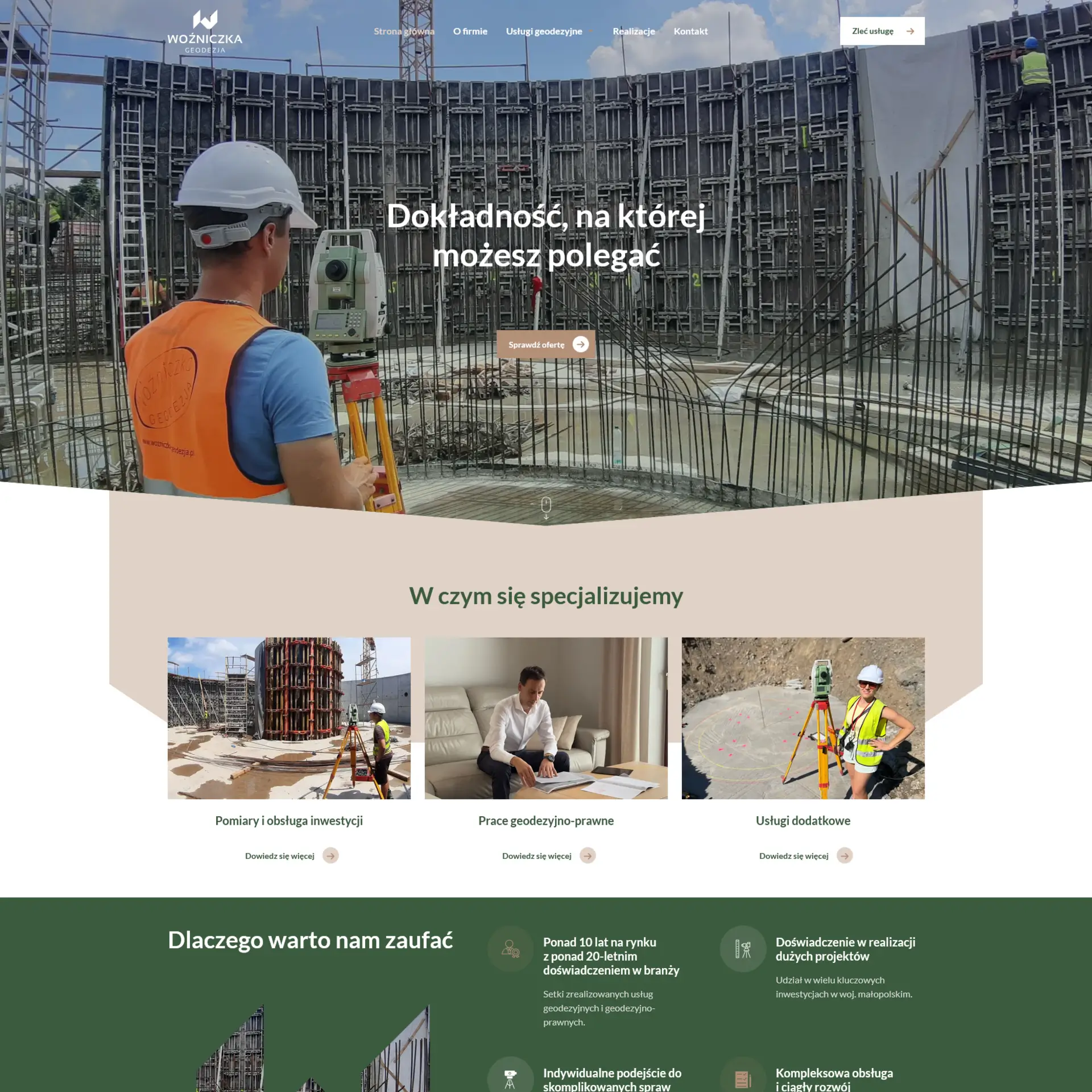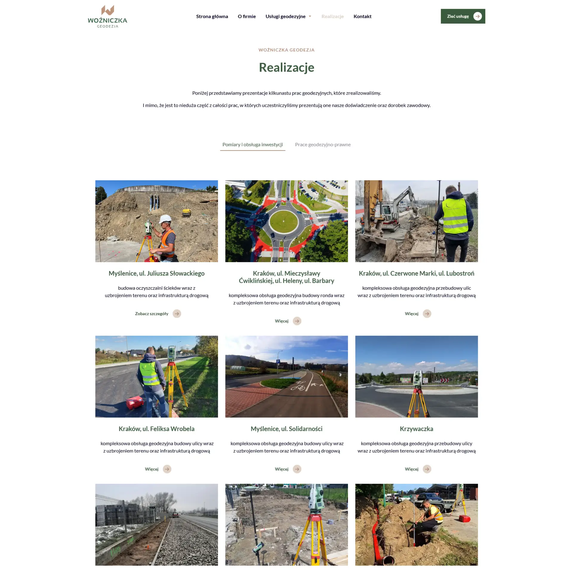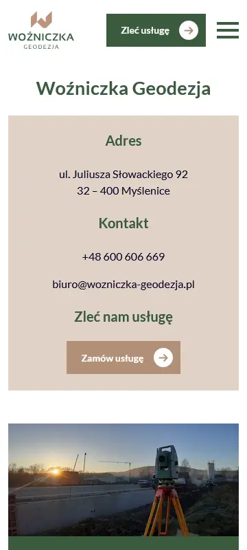 Strona internetowa Woźniczka Geodezja została zaprojektowana jako prosty i przejrzysty serwis informacyjny, którego głównym celem jest czytelna prezentacja zakresu usług oraz skuteczne pozyskiwanie zapytań od klientów.