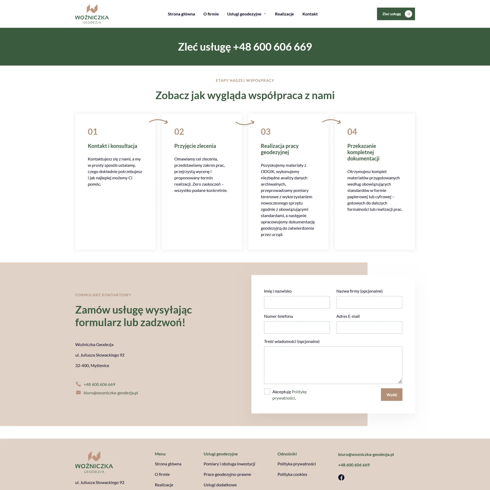 - Podstrona finalizująca kontakt („Zleć usługę”)