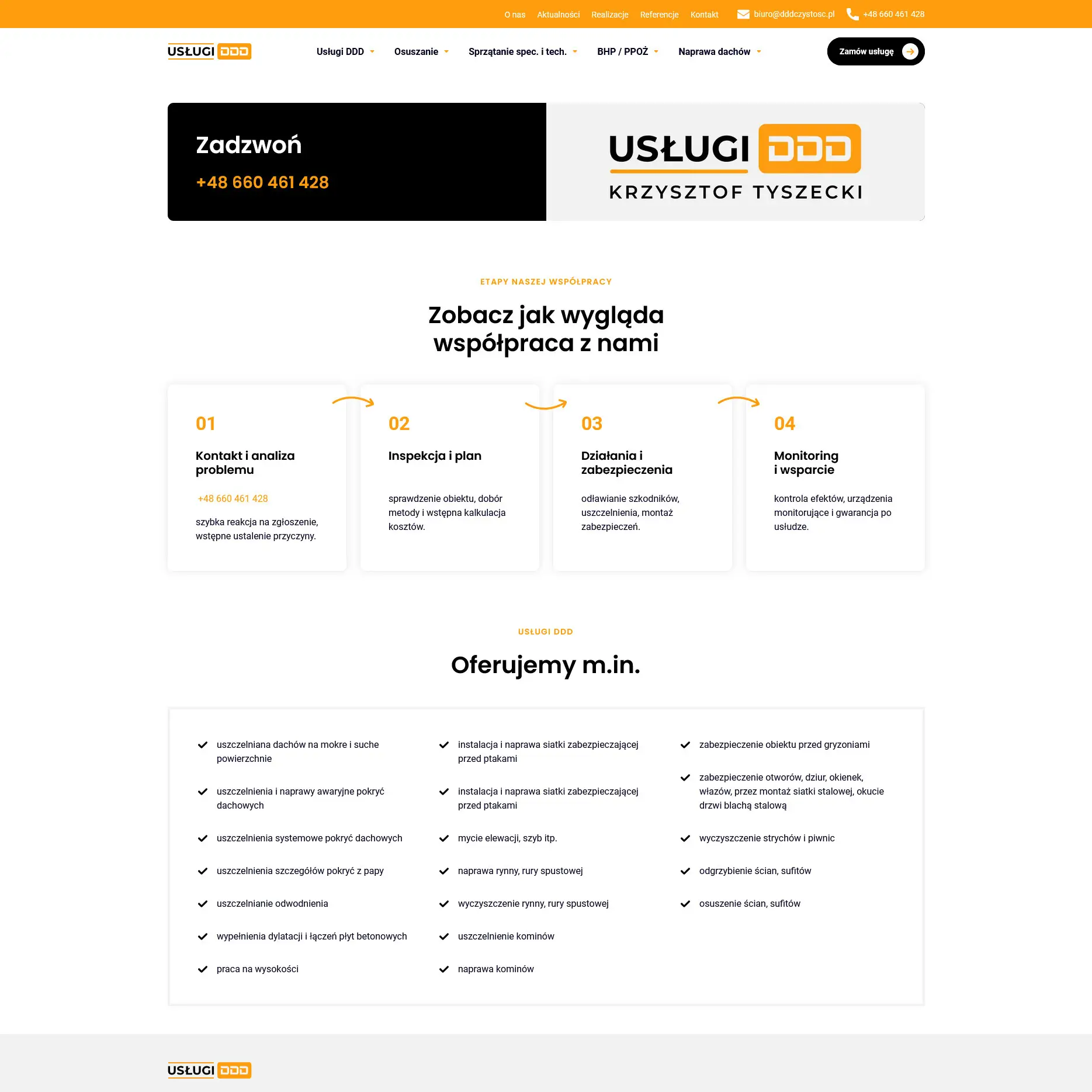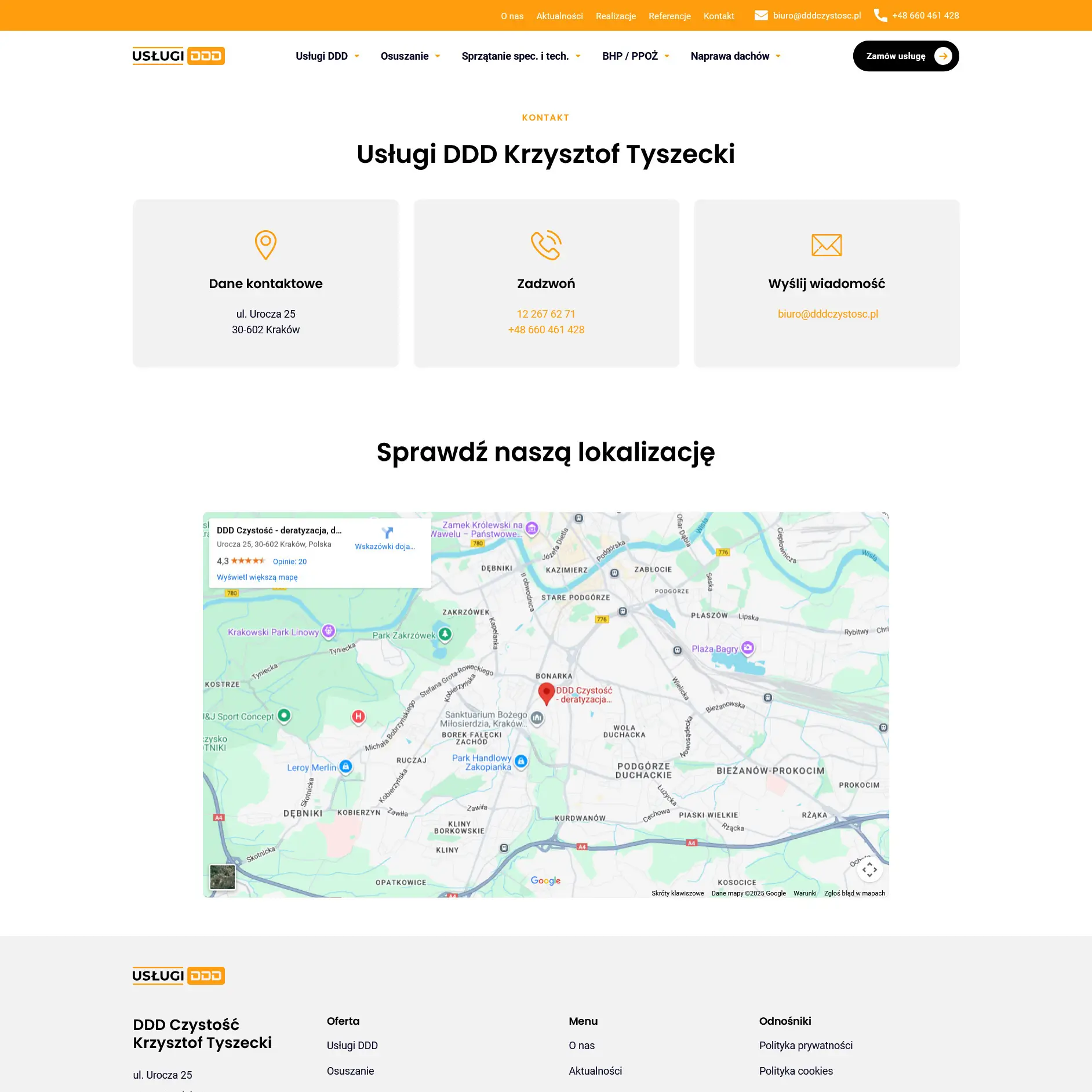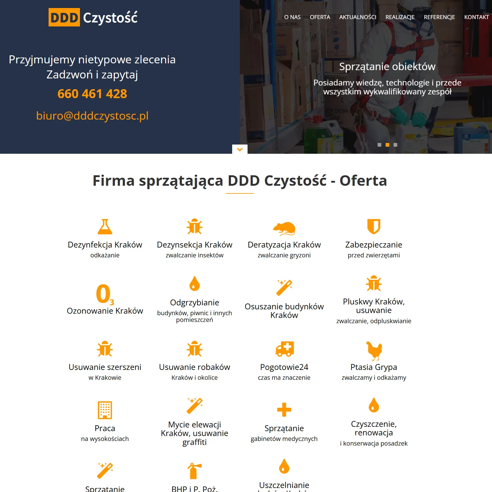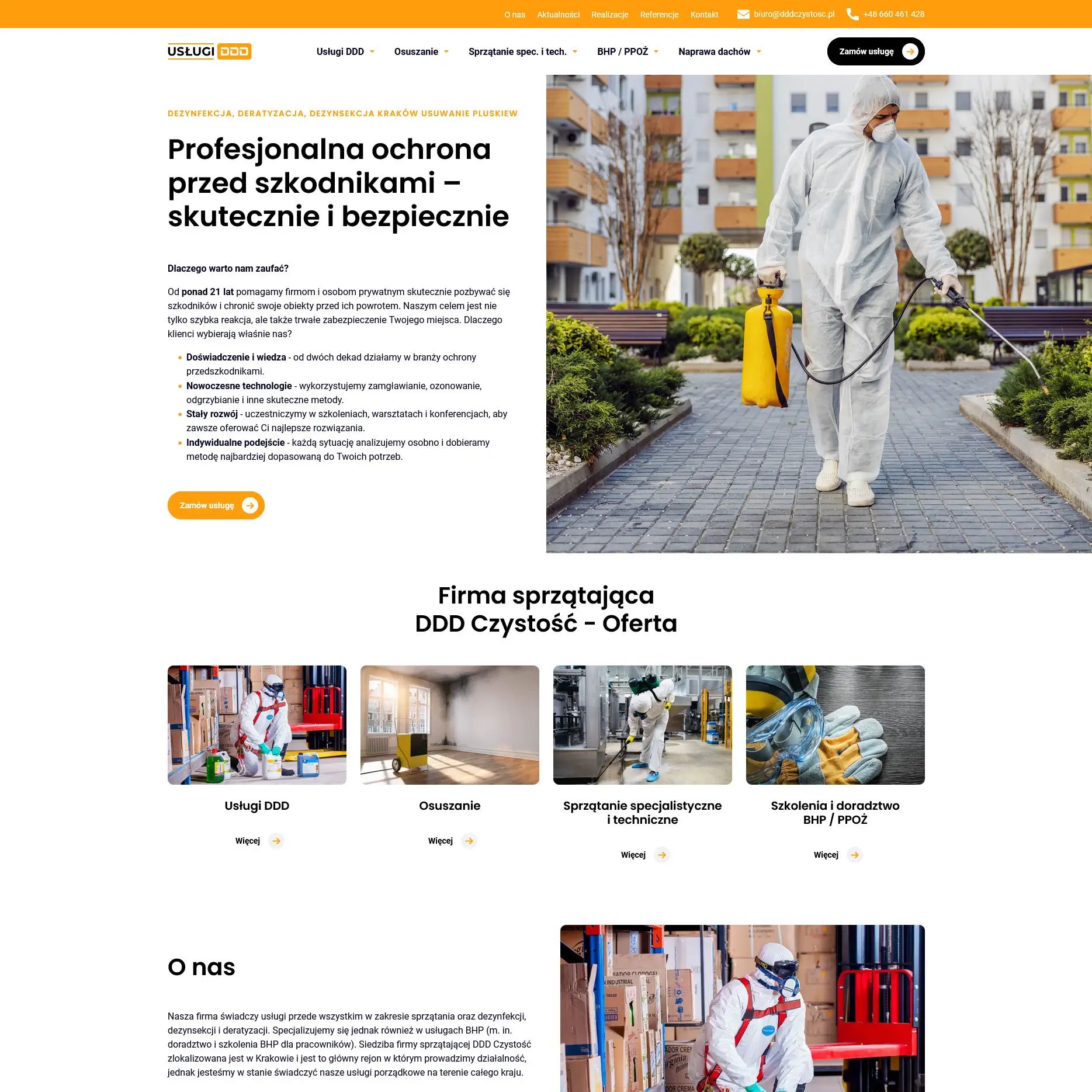 Dla firmy DDD Czystość zaprojektowaliśmy rozbudowaną stronę usługową, której celem jest prezentacja szerokiej oferty firmy, wsparcie działań SEO oraz budowanie zaufania marki.