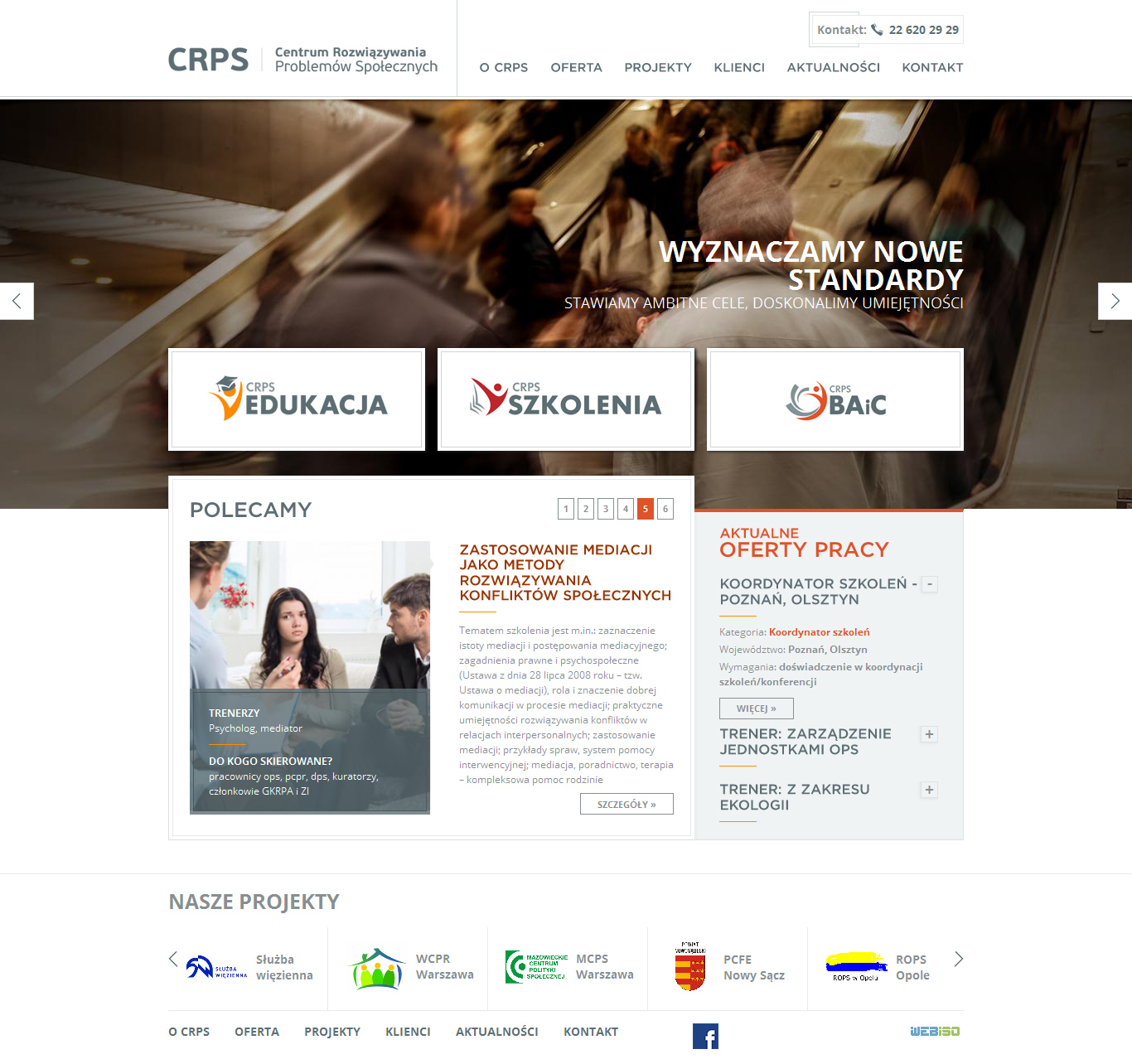 Dla Centrum Rozwiązywania Problemów Społecznych agencja Webiso zaprojektowała i wykonała nowoczesny serwis internetowy utrzymany w poważnym tonie, odpowiednim dla firmy świadczącej usługi dla instytucji państwowych. Ważną część strony, na którą warto zwrócić uwagę, stanowi baza ofert pracy umożliwiająca klientowi wygodne zamieszczanie nowych ogłoszeń. Na stronie głównej znajduje się moduł aktualności wyświetlający m. in nowe oferty pracy oraz duży slider z wyróżnioną ofertą firmy.